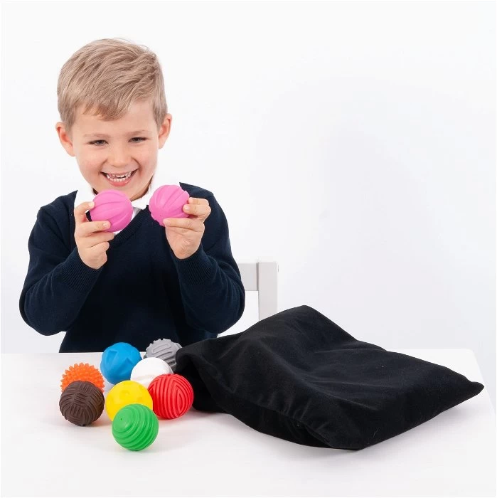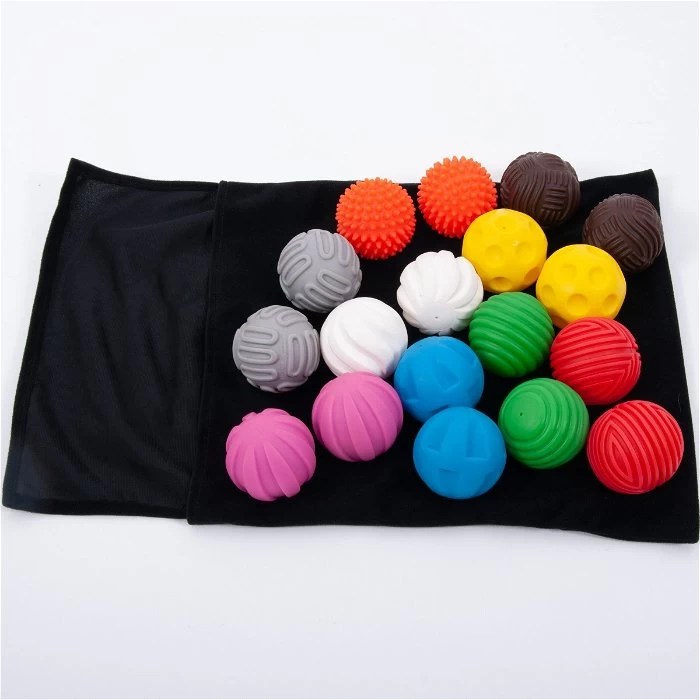 De ballen worden geleverd in 9 paren en met een zwarte zak, die je kunt gebruiken als een voelzak. Probeer met je hand in de zak te voelen welke bal je vast hebt.