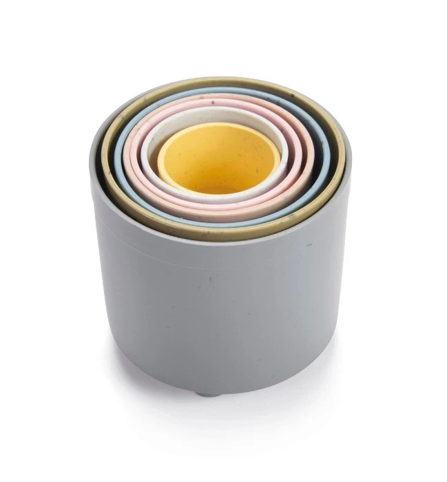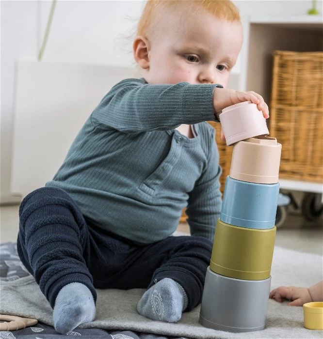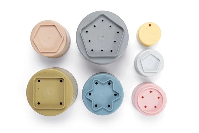 De bekers hebben verschillende vormen aan de onderkant. Sommige zijn hol en andere hebben de vorm van een ster. Hiermee kun je de bekers gebruiken in stapelspellen, in de zandbak, als constructiebekers of als zeefjes. Ook te gebruiken in bad als ‘douchekop’. Alleen beperkt door verbeelding.