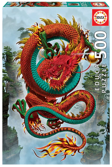 Deze puzzel van 500 stukjes met een mysterieuze, Oosterse geluksdraak ademt de sfeer van Skylander of Avatar, met vliegende eilanden op de achtergrond.