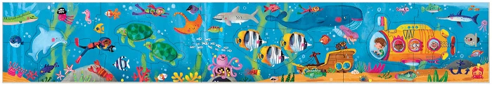 Leuke, langwerpige puzzel van 26 stukjes waarbij je samen met de duikers en de duikboot de wereld onder het zeeoppervlak ontdekt. “Kom je lekker zwemmen, drijven en dromen? De zee is zo prachtig!”