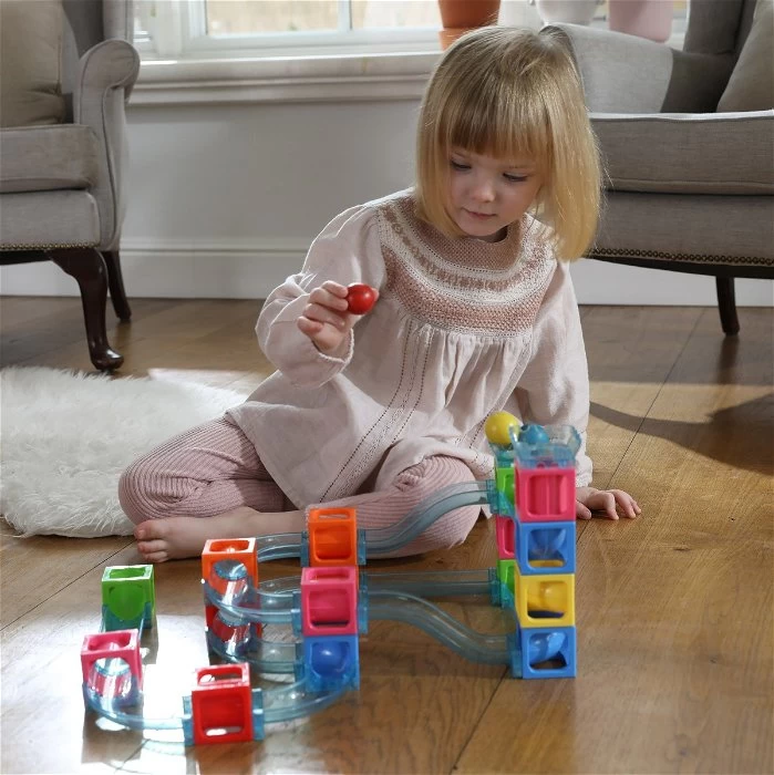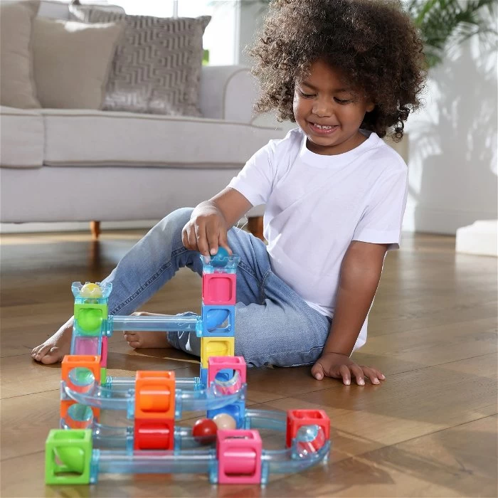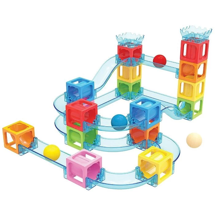 Laat je kind de ballenbaan zelf in in elkaar zetten. Zo leert je kind logisch na te denken en de onderdelen op de juiste plek te zetten en een mooi parcours voor de ballen te maken.