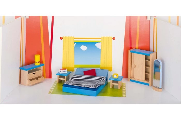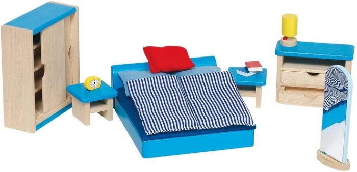 Zelfs de papa en mama poppen in je poppenhuis worden moe, en moeten s’nachts slapen. Geef ze daarom een fijne plek om te slapen. Met deze meubelen kan je kind zelf de slaapkamer inrichten. Vergeet niet de wekker en de boeken op het nachtkastje.