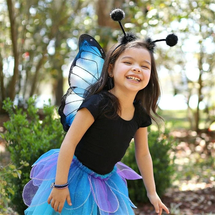 De maat past voor kinderen van 4-6 jaar, maar 3-jarigen met kleine, dikke buiken kunnen met deze outfit ook makkelijk een mooie, blauwe kever-vlieg-fee worden.
