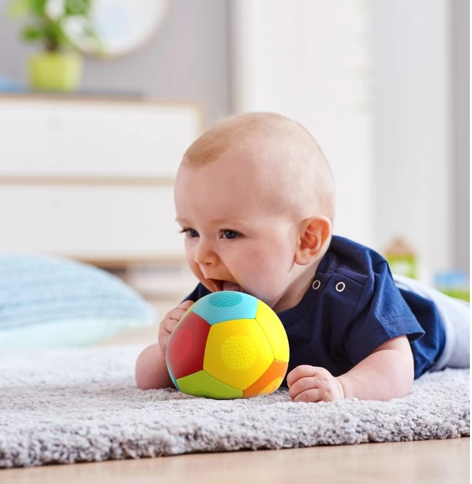 Met zijn vrolijke kleuren en schattige patronen is deze babybal een superleuke eerste bal voor de baby.