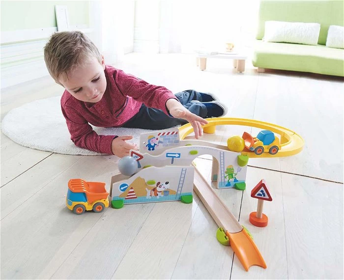 Deze mooie bouwplaats is een deel van Haba’s nieuwe Kullerbü knikkerbanen voor de kleintjes vanaf 2 jr. De knikkers zijn Ø 4,5 cm en kunnen dus niet worden ingeslikt.