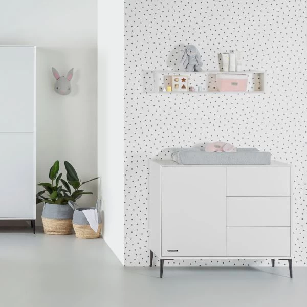 Met de Kidsmill Lasse Commode haal je stijl in huis. De zwarte pootjes maken de commode tot een echte eyecatcher! De commode biedt met drie lades genoeg ruimte voor het opbergen van bijvoorbeeld verzorgingsproducten en luiers. De lades duw je eenvoudig open dankzij het “push open” systeem. Doordat de commode is voorzien van soft closing kun je de lades en deur weer geruisloos sluiten. Dankzij het grote commodeblad kun je jouw kindje makkelijk verschonen. Met behulp van de apart verkrijgbare bladvergroter is het mogelijk om het werkblad van de commode nog groter te maken. De commode is gemaakt van stevig materiaal en voldoet aan de Europese veiligheidseisen. Verder past de Kidsmill Lasse Commode perfect bij de andere meubels van de Lasse babykamer.