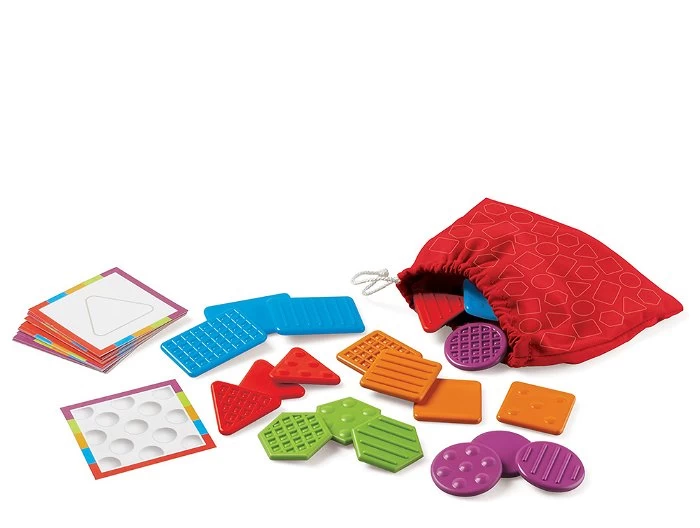 Jullie kunnen bijv. een voelspel spelen door in het stofzakje te grijpen en te proberen twee gelijke schijven te vinden zonder ze te zien.