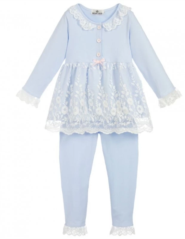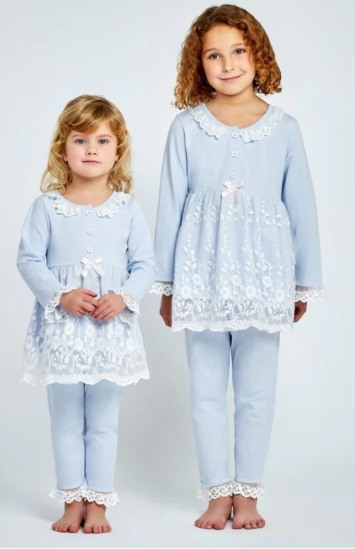 Prachtige lichtblauw, katoenen jersey pyjama voor meisjes. Met een bovenlaag van gebloemd kant aan de bovenkant, bies aan de kraag en manchetten en een kleine roze strikrand.