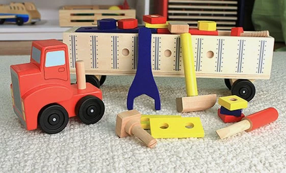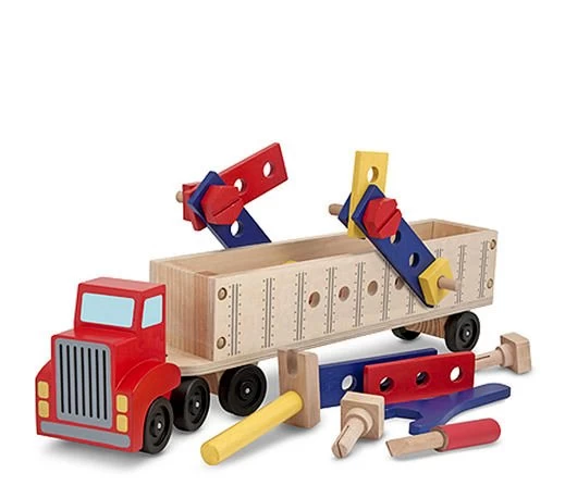 De trailer van de vrachtwagen is gevuld met 22 stukken stevig, houten gereedschap die je kind op de bouwplaats kan gebruiken.