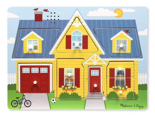 Als je kind een van de 8 stevige stukjes optilt, hoor je het geluid van de activiteit die bij de bijbehorende kamer past.