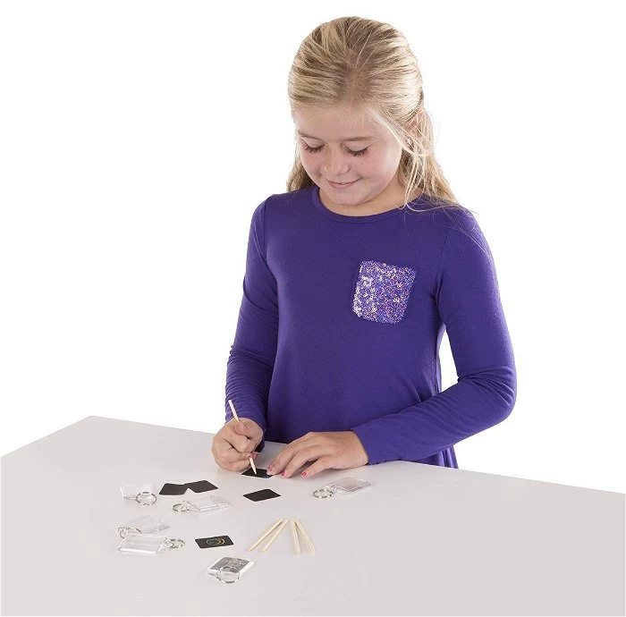 De set bevat 6 sleutelhangers, 6 vellen Scratch Art papier en 6 pennen om prachtige regenboogkleuren tevoorschijn te krassen. Als je leuke tekeningen gemaakt hebt, doe je het papier gewoon in de sleutelhangers en dan is het cadeautje klaar.