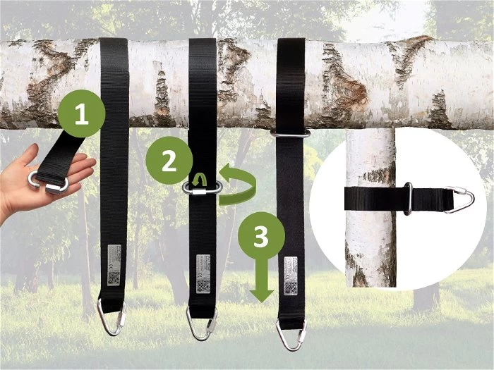 De karabijnhaak is ultrasterk, dus het enige waar je zeker van moet zijn, is dat de boomstam of tak sterk genoeg is om de last te dragen.