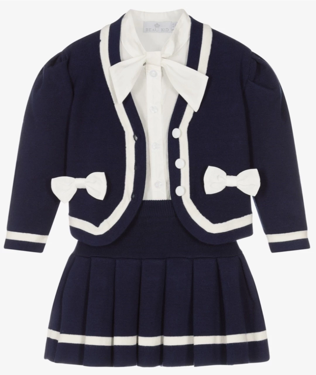 Prachtige set van mooie kwaliteit Een mooie plooi rok met bijpassende vest en blouse. De set is navy blauw met strik detail. De rok en colbert is gemaakt van wolmix stof. Een mooie set met luxe uitstralling.