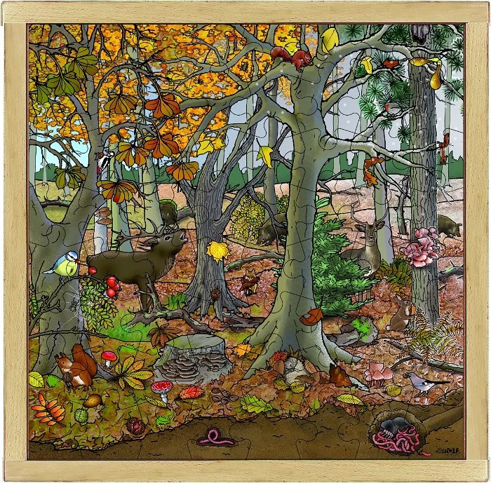 64 stukjes, met veel details van een bos in de herfst. De eerste sneeuw valt, de eekhoorn verzamelt zijn wintervoorraad en de mol is in z’n holletje gekropen en smult van de dikke regenwormen.