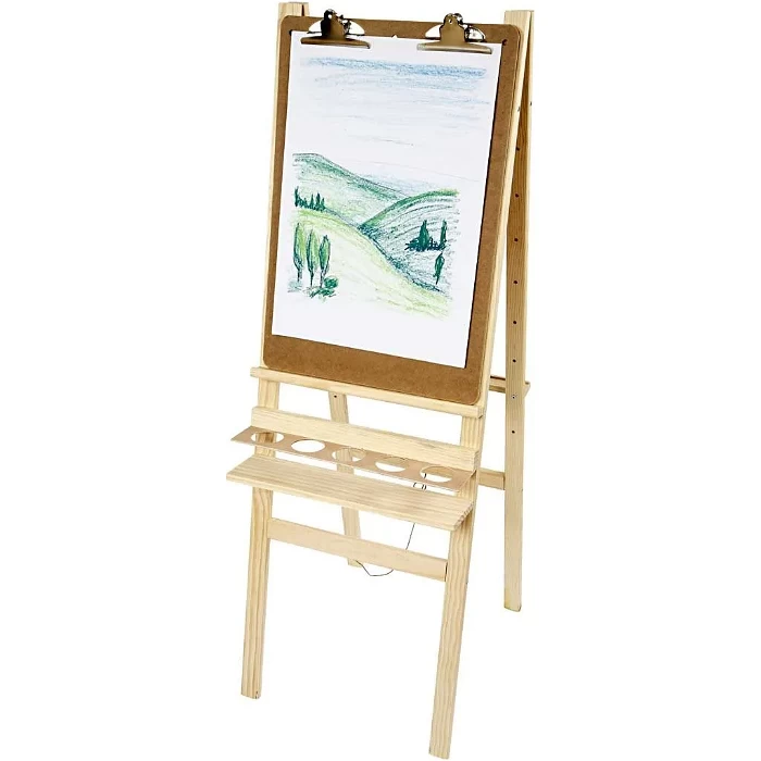 Er is ook een plank waar je bakjes met verf en penselen kunt neerzetten/leggen. De schildersezel kan worden ingeklapt.