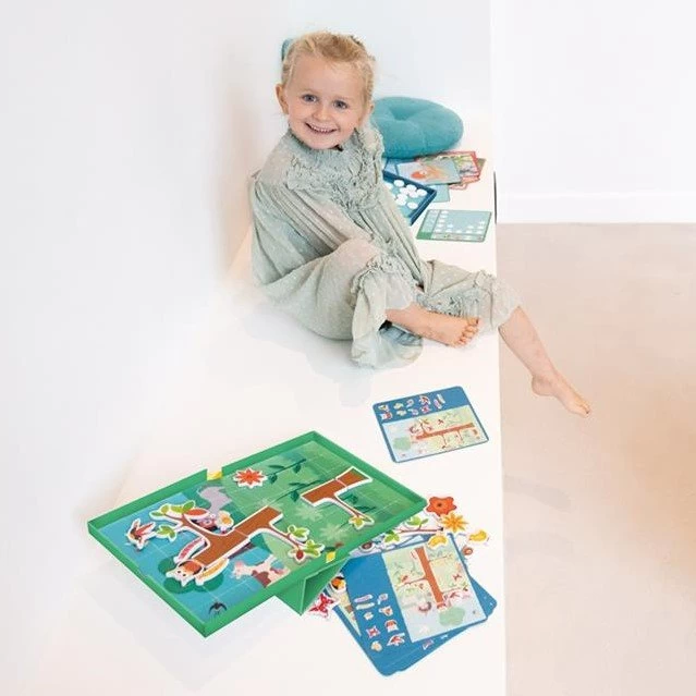 Je kind oefent zich in het observeren en oriënteren wanneer het de taakkaarten op het bord namaakt. Het spel helpt je kind ook om voorzetsels te leren zoals voor, naast, links, boven en onder.
