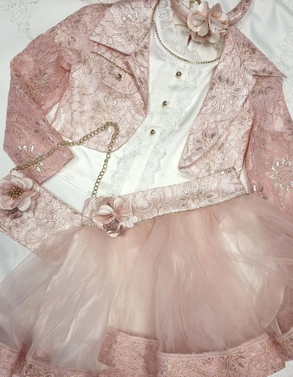 Luxe set compleet. Een prachtige set van mooie kwaliteit. Een tulle rok met kanten blouse en bijhorende jasje, tasje en haarband. Een mooie set met luxe uitstralling.
