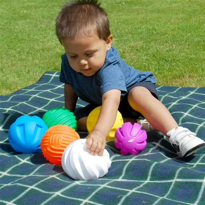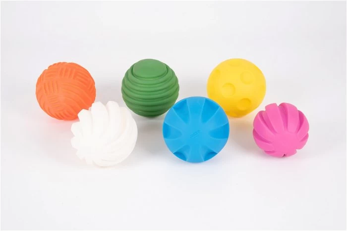 Goede, stevige tactiele ballen die je kind met beide handen kan vastgrijpen – en die er tegen kunnen om op geknabbeld te worden.