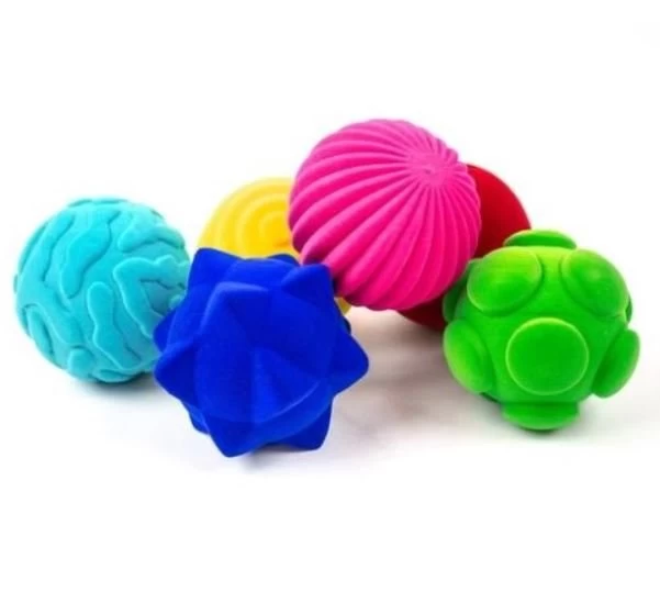 6 leuke ballen met een mooi, ruw oppervlak, mooie kleuren en speelse vormen.